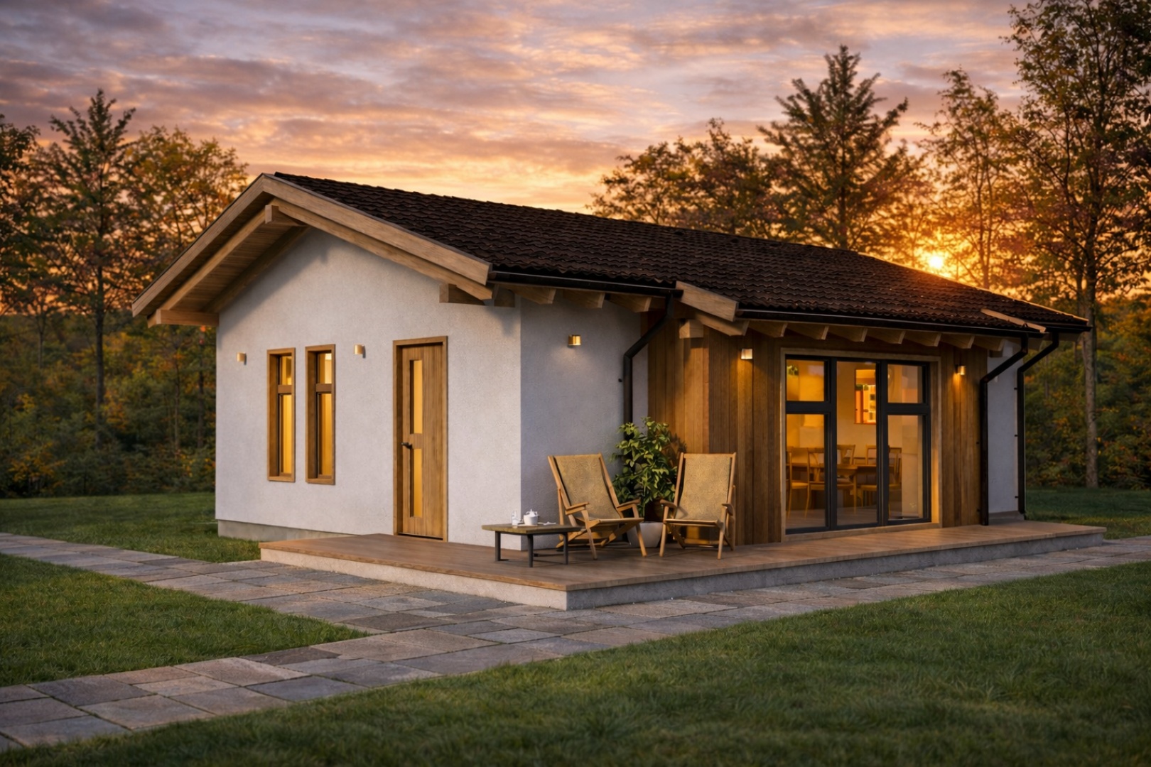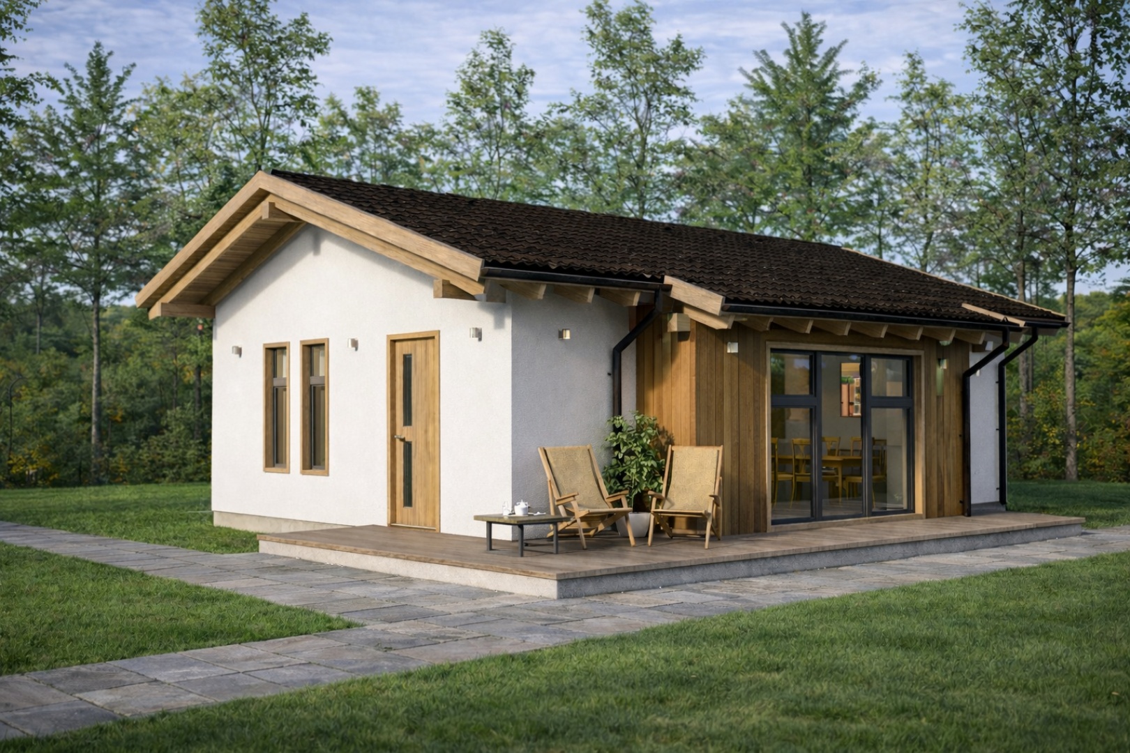 Компактная планировка дома FORMULA 54 порадует вас своей практичностью. На первом этаже расположены две уютные спальни, санузел и просторная кухня-гостиная с выходом на террасу