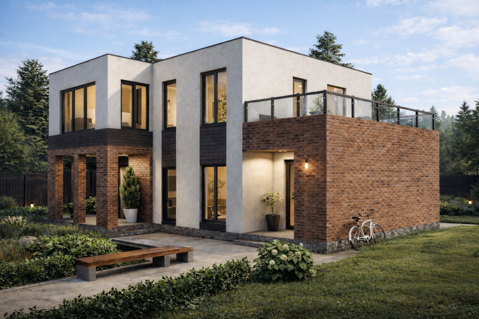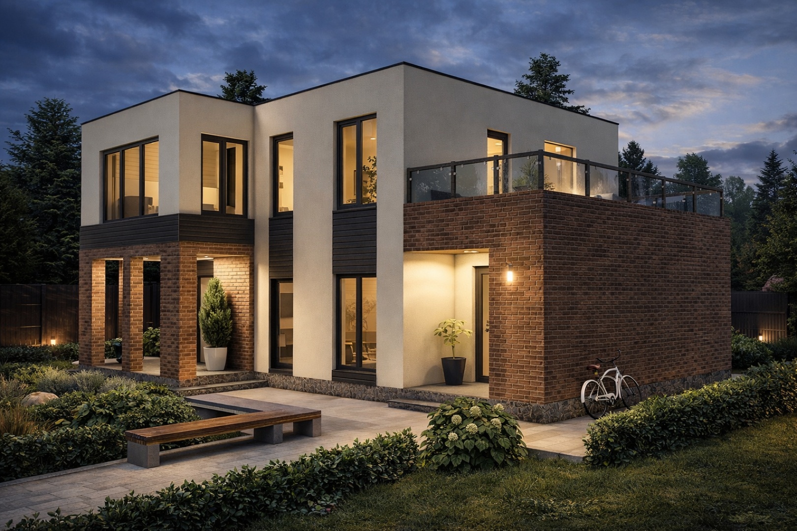 Оптимальный современный дом с плоской эксплуатируемой кровлей и большим балконом.